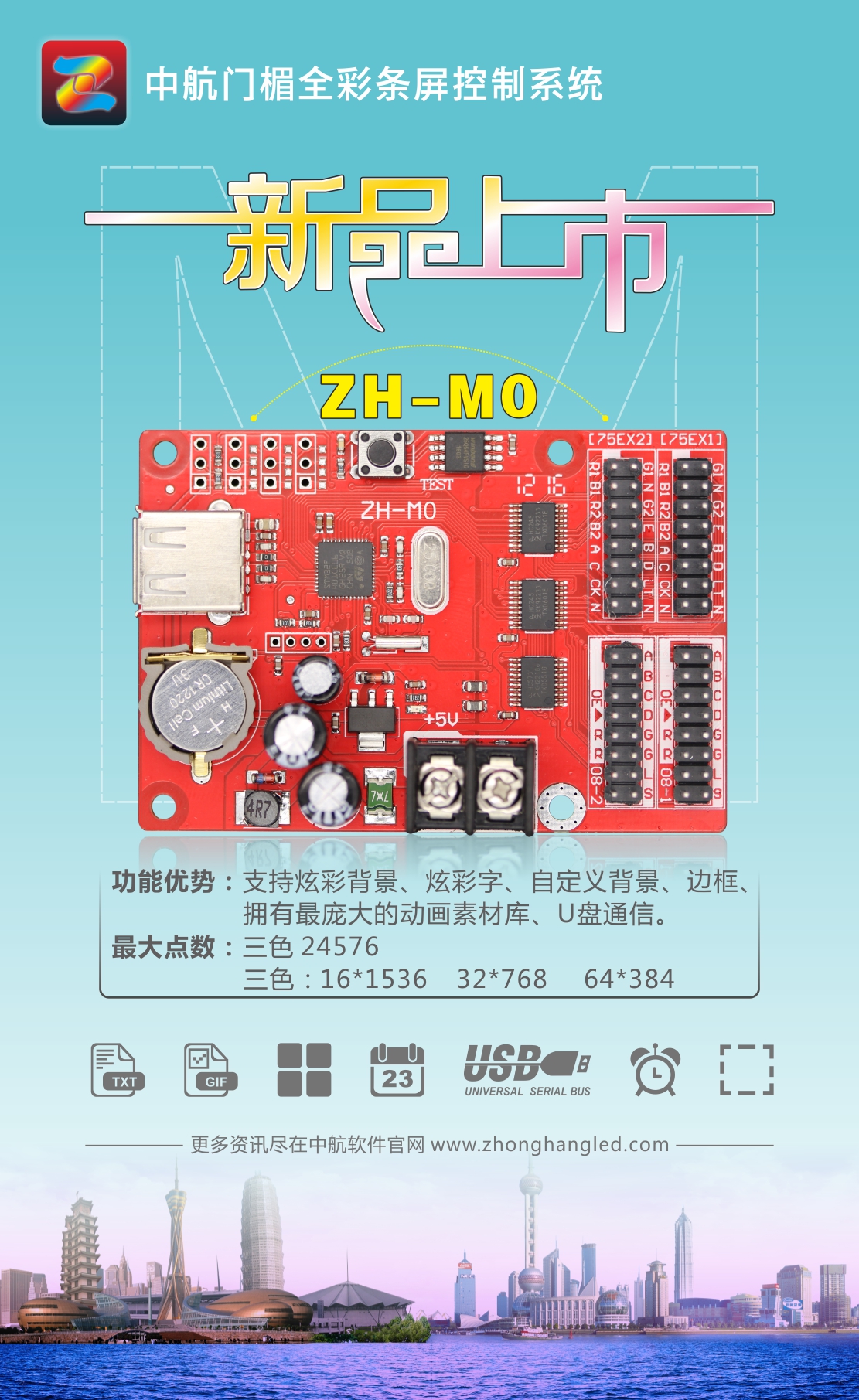 溫馨提示:門楣全彩條屏控制系統(tǒng)需下載專用軟件,請到我們官網(wǎng)(www.zhonghangled.com)下載中心里下載。