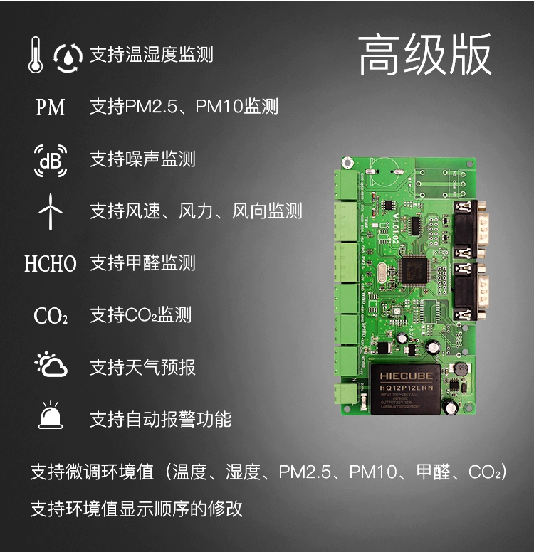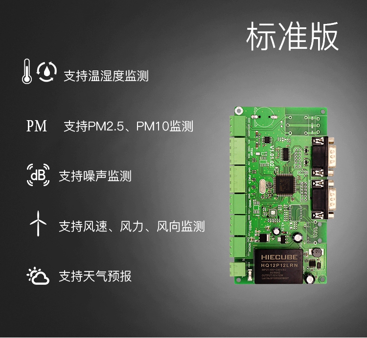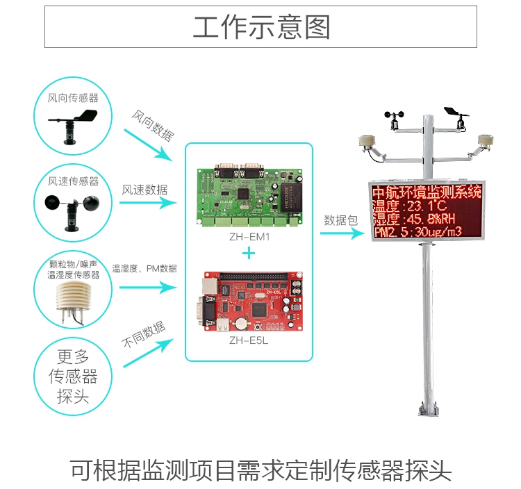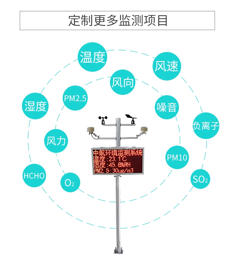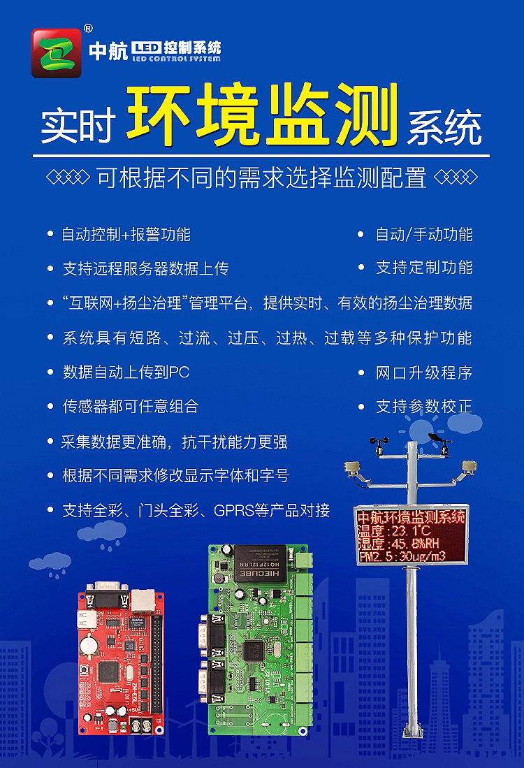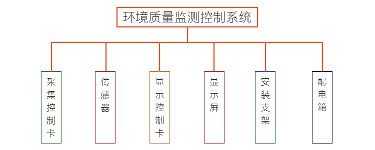 環(huán)境質(zhì)量監(jiān)測控制系統(tǒng)包括采集控制卡、傳感器、顯示控制卡、顯示屏、安裝支架、配電箱六個部分組成。